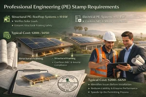 California solar permitting typically requires professional engineering stamps for larger installations. Structural PE stamps are generally necessary for rooftop systems exceeding 10 kW, verifying that buildings can support solar array loads considering roof framing and seismic conditions. Meanwhile, electrical PE stamps usually kick in for systems over 50 kW, confirming designs meet NEC requirements.