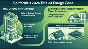 California’s Title 24 Energy Code, particularly Part 6, establishes mandatory requirements that directly impact California solar permitting. The 2025 Building Energy Efficiency Standards, effective January 1, 2026, introduce significant updates that solar professionals must understand.