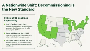 Similarly, Georgia implemented mandatory solar decommissioning requirements in January 2025 for companies leasing property for solar farms exceeding 13 acres. Meanwhile, South Carolina followed with comparable regulations requiring both decommissioning plans and financial assurance mechanisms.