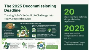 The solar industry faces a mounting challenge as thousands of installations approach end-of-life. Indeed, with 20 states now enforcing statewide solar decommissioning regulations and critical compliance deadlines arriving in 2025, solar installers and EPCs must understand these requirements to avoid costly penalties. Fortunately, proper solar waste management planning ensures regulatory compliance while unlocking recycling opportunities worth billions of dollars.